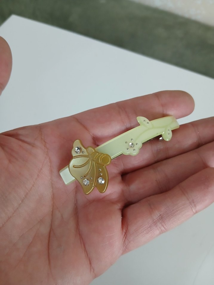 Bej renkte, plastikten yapılmış, fiyonk ve küçük taş detaylı minimalist bohem tarzda kadın saç tokası.