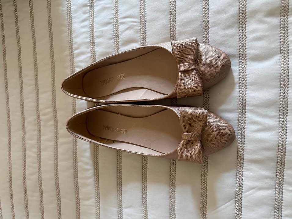 Bej renkli, dolgu topuklu kadın babetler, fiyonk detaylı ve modern klasik tarzda, kauçuk malzemeden yapılmıştır, günlük kullanım için uygundur.