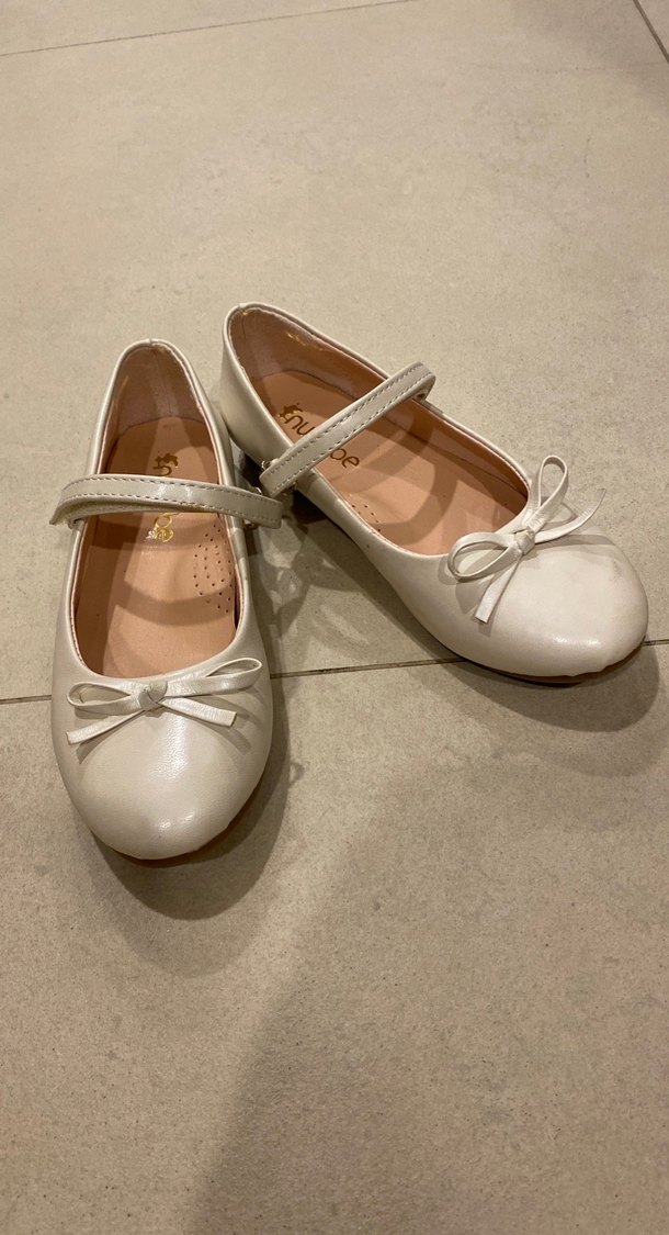 Bej renkte, fiyonklu ve bantlı kız çocuk babeti. Modern klasik tarzda, kauçuk malzemeden yapılmıştır. Sadece sınıf gecesinde kullanıldı,temiz hasarsız ama sağ ayakkabının dış kısmında bi renk var çıkarmak için uğraşmadım açıkçası,çok şık özel günlerde kullanmak için.Rengi tam beyaz da değil tam bej değil,kırık beyaz diyebilirz