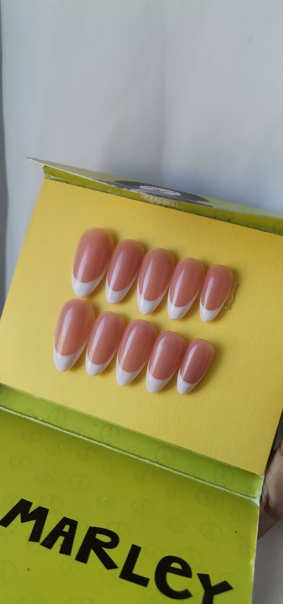 Bej renkte, beyaz Fransız uçlu takma tırnak seti. Doğal ve şık bir görünüm sağlar.