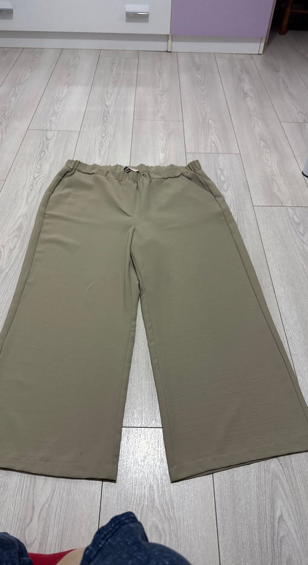 Bej renkte, rahat kesim kadın kumaş pantolon. Yumuşak sentetik kumaştan, gündelik ve rahat kullanım için uygundur.