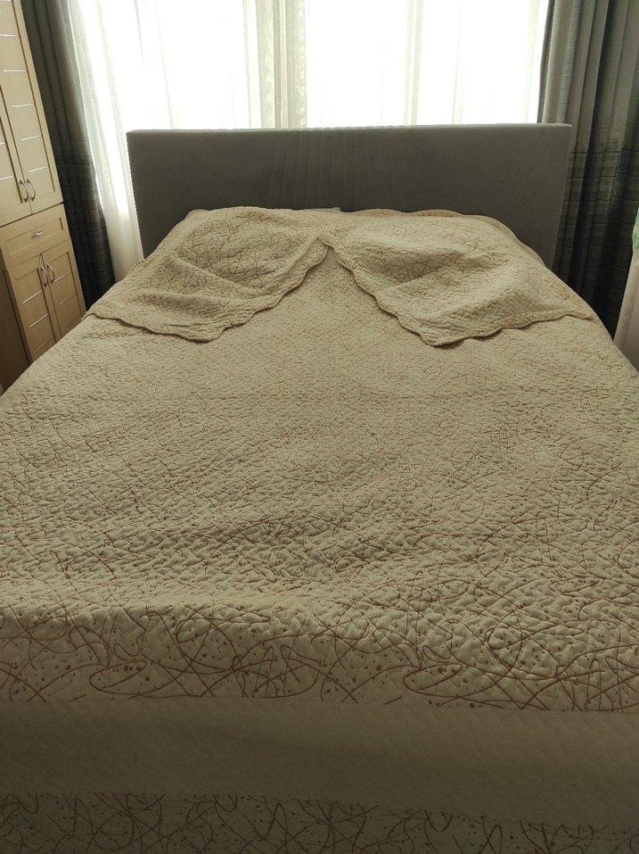Çift kişiliktir.Bej renkli, yumuşak dokulu ve kenarlarında hafif desen bulunan rahat görünümlü yatak örtüsü. ️Bir adet yatak örtüsü ve 2 adet yastık kılıfı vardır. Çok az kullanıldı tertemizdir.