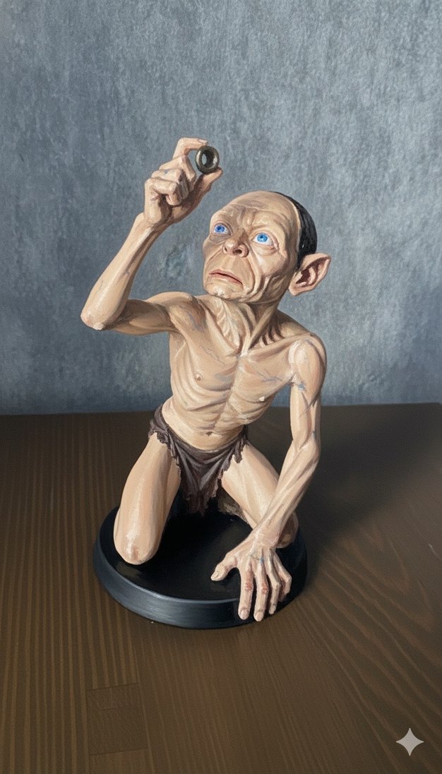 Bej renkli Gollum figürü, detaylı işçilik ve etkileyici mavi gözlerle karakterin yüzüğünü tuttuğu ikonik pozunu yansıtıyor. Siyah taban üzerinde duruyor. ♂️