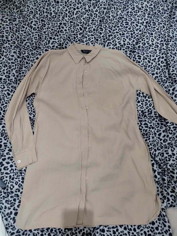 Refka marka bej renk gömlek tunik. Rahat kesimi ve midi boyu ile günlük sokak stili için uygundur.