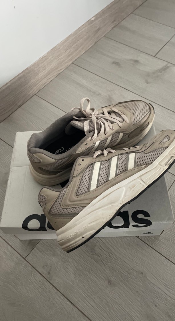 44 numara Bej ve gri Adidas bağcıklı spor ayakkabılar, düz kauçuk taban ve nefes alabilen file üst yüzeye sahiptir, günlük sokak stili için uygundur.