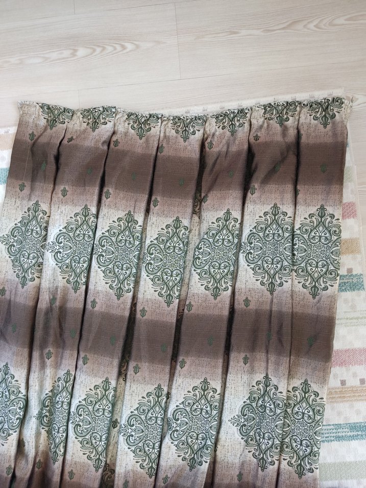 Bej renkli, gri bağlama deseni ve geleneksel süslemelerle klasik görünümlü perde. iki adettir