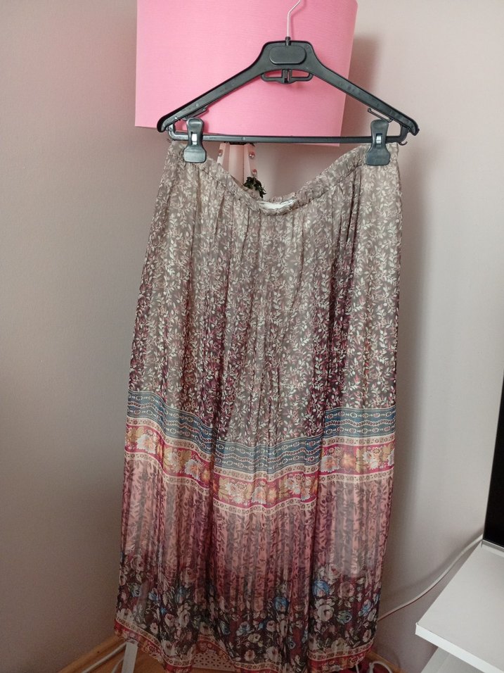 Bej ve gri tonlarda bağlama desenli, pilili ve bol kesim uzun etek. Yumuşak sentetik kumaştan üretilmiştir.