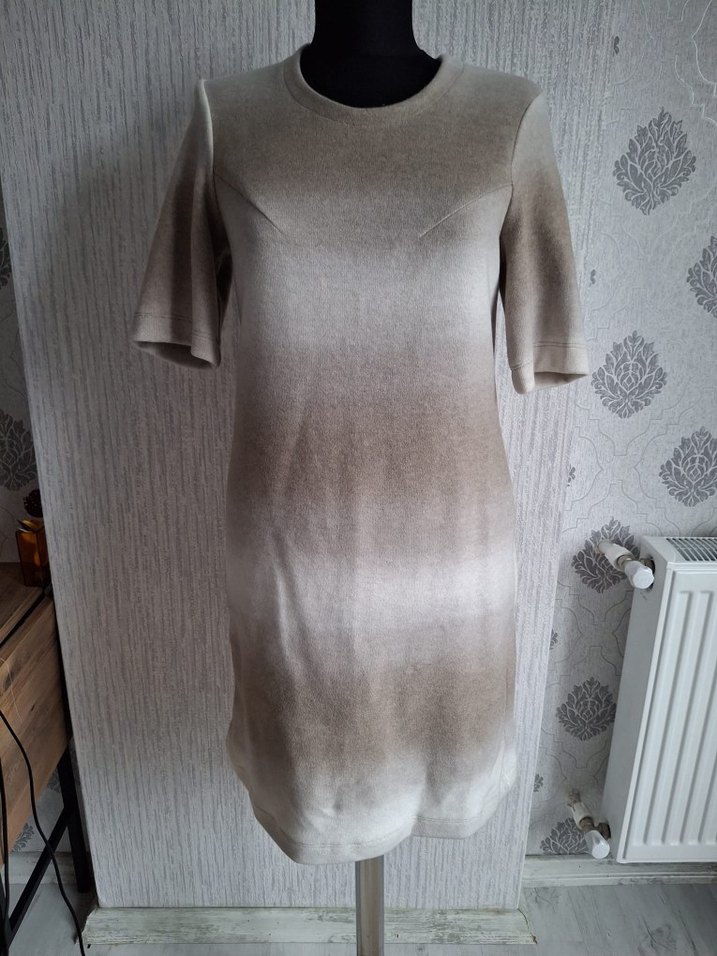Yuvarlak yaka, kısa kollu, gevşek kesim triko midi elbise. Bejden griye geçişli bağlama desenli, yumuşak sentetik kumaştan üretilmiştir.