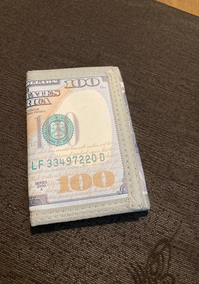 Bej ve gri tonlarda baskılı vintage tasarıma sahip erkek cüzdanı. Mütevazı, karşı kültür tarzında, üzerinde 'LF33497220D, RIOA' detayı bulunur.