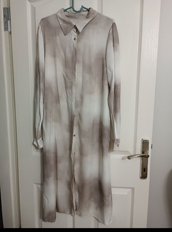 Bej ve gri tonlarda batik desenli,, dökümlü kesimli kadın tunik. Uzun kollu, yakalı ve minimalist tarzda, günlük kullanıma uygun. hiç kullanılmadı 38,40 beden uyumlu