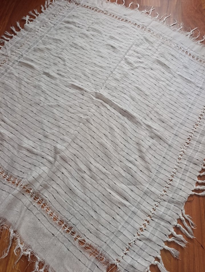 Bej ve gri tonlarında, ince çizgili ve püsküllü kenarlarıyla bohem tarzda masa örtüsü. ipek gibi yumuşak bir dokusu var. sade.. kullanılmadı. kare