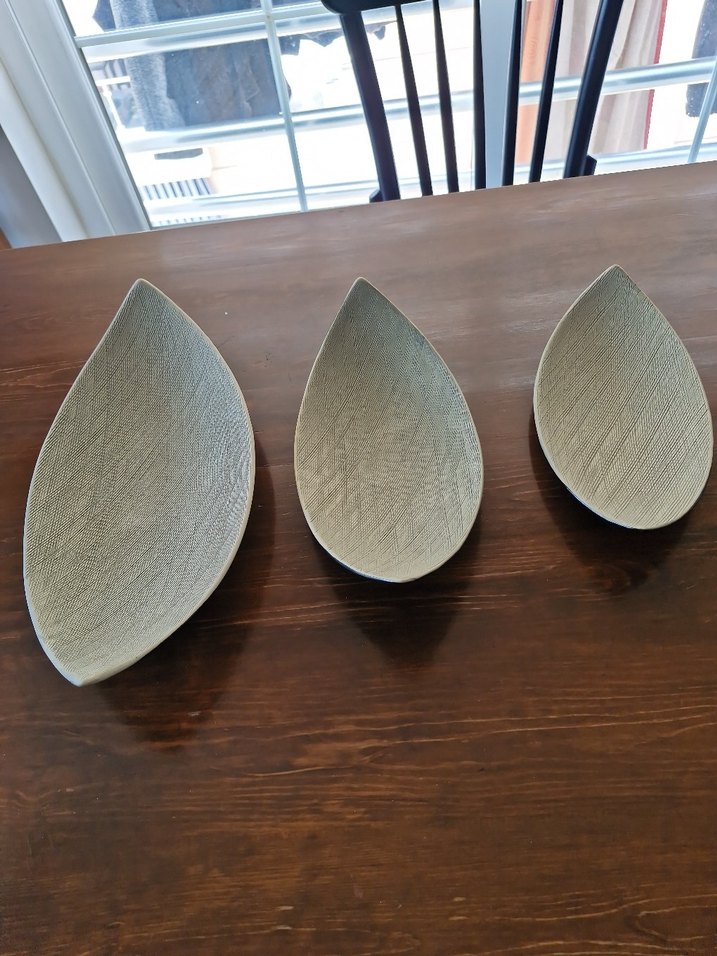 Bej ve gri tonlarında, yaprak şeklinde, dokulu yüzeye sahip çağdaş tarzda üç boy tabak seti. Çeşitli sunumlar için uygundur. ️