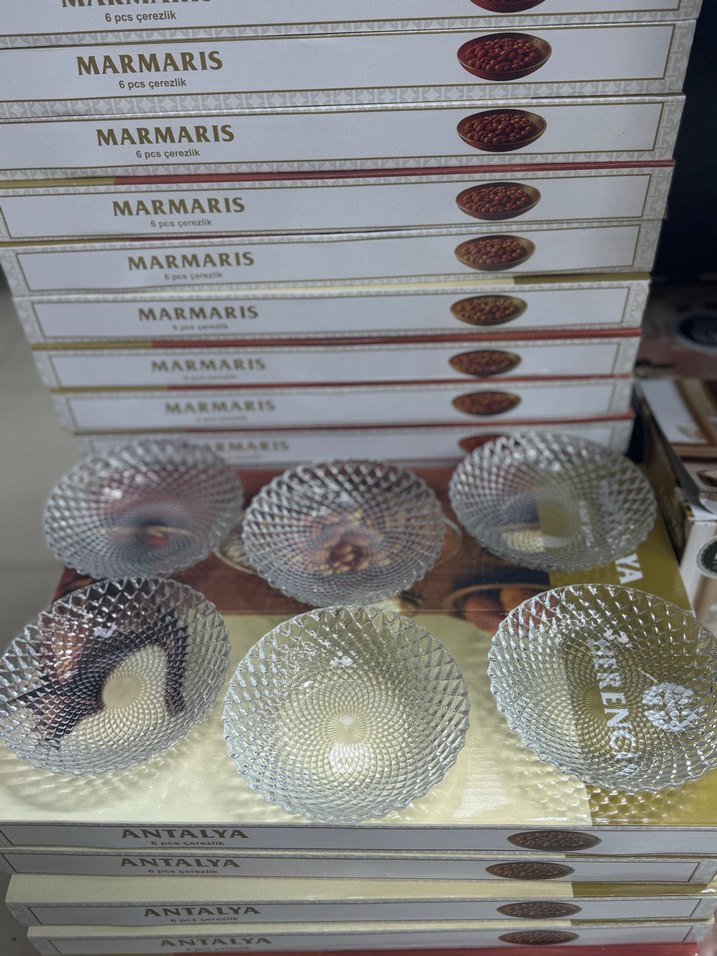 Bej ve gri renklerde, dokulu desenlere sahip 6'lı cam çerezlik seti. Kutularda farklı yer isimleri yazıyor.