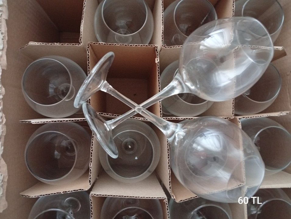 Bej ve gri renklerde uzun saplı cam kadehler seti, karton kutularda paketlenmiş. İçecek servisi için uygundur.