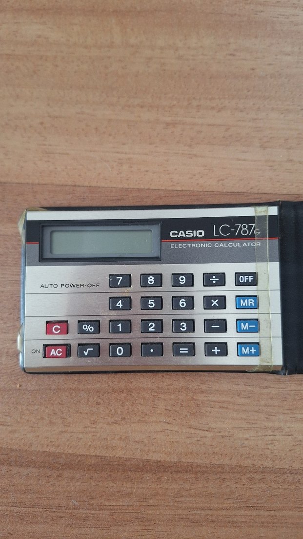 Casio LC-787 elektronik hesap makinesi, MR, AC ve OFF fonksiyonlarına sahip gri ve bej tuşlarla. Otomatik kapanma özelliği ve kompakt tasarım içerir.