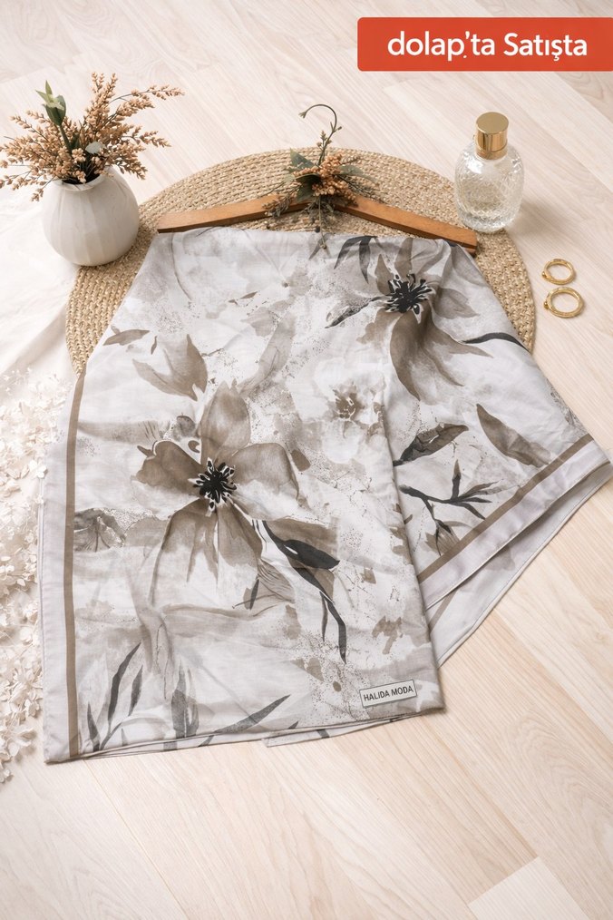 İpek dokulu, bej ve gri çiçek desenli kadın şal. Bohem tarzda, klasik şıklığı yansıtan drapeli tasarım.