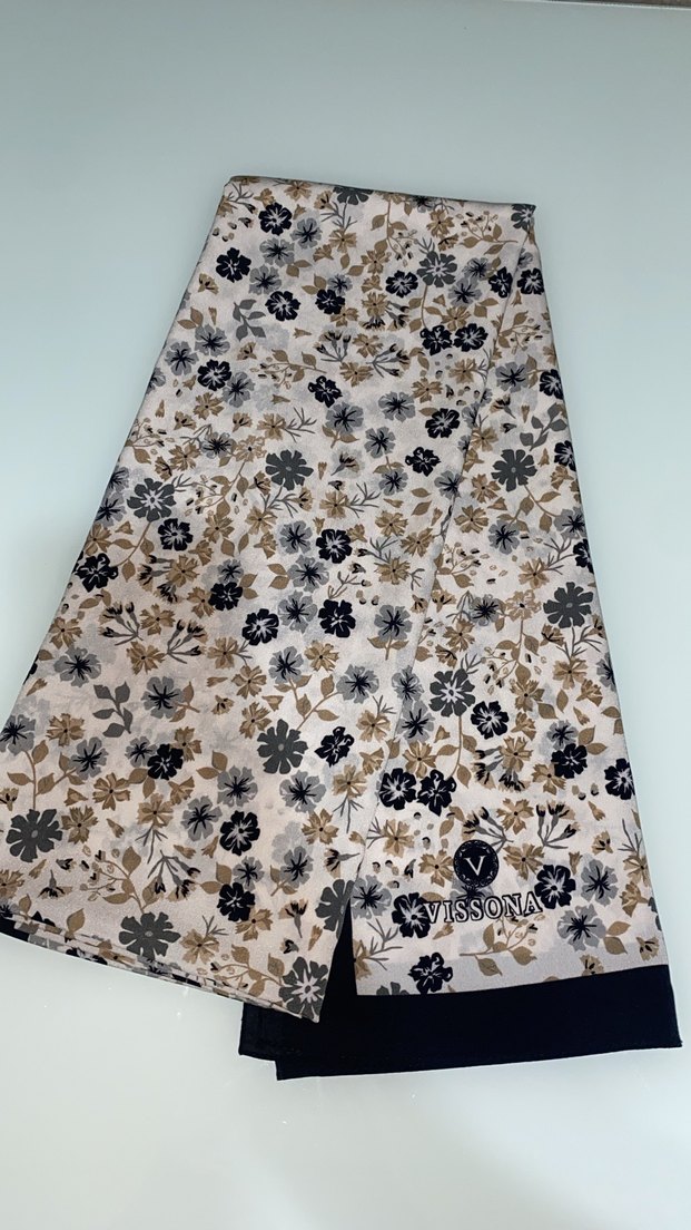Bej ve gri renklerde, çiçek desenli ve drapeli kadın fular. Sentetik kumaştan üretilmiş, klasik tarzda ve Vissona logosu detaylı.