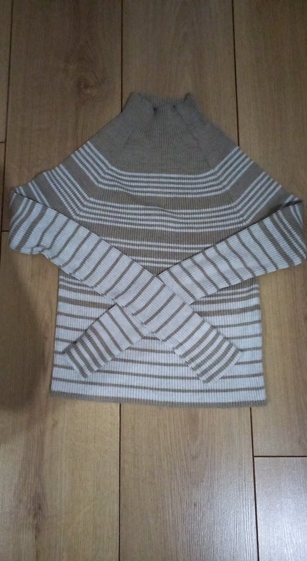 Bej ve gri çizgili, boğazlı ve uzun kollu bu fitted triko kazak, günlük kullanıma uygun rahat ve çağdaş bir stil sunar.
