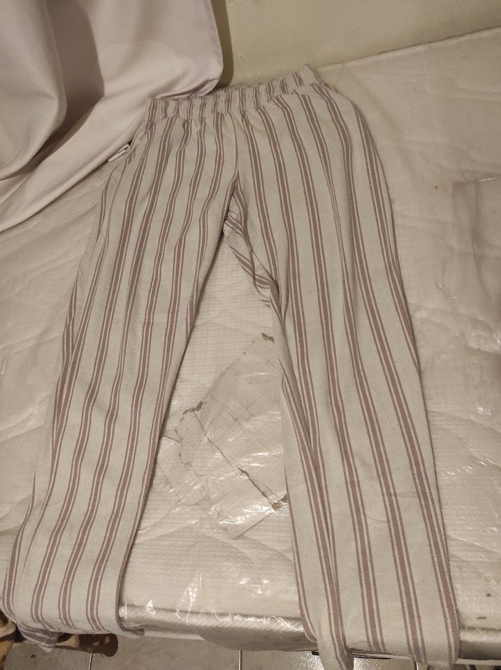 Bej ve gri çizgili, keten kumaştan bol kesim, pileli midi uzunlukta eşofman. Günlük rahat tarz için uygundur.