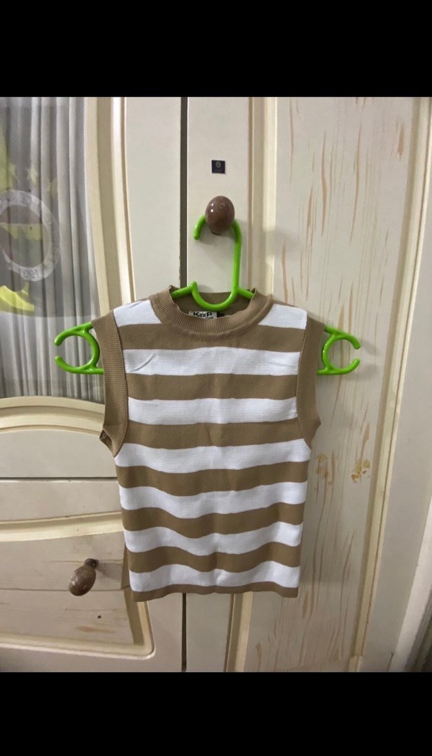 Bej ve gri yatay çizgili, kolsuz çocuk atleti, yumuşak kumaştan üretilmiştir. etiketi yoktur (iade yoktur)