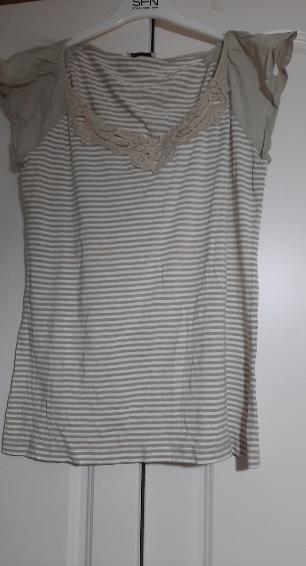 Bej ve gri çizgili, dantel detaylı, kısa kollu, kayık yaka ve rahat kesimli kadınbluzu. Yumuşak keten kumaştan, günlük kullanıma uygundur.