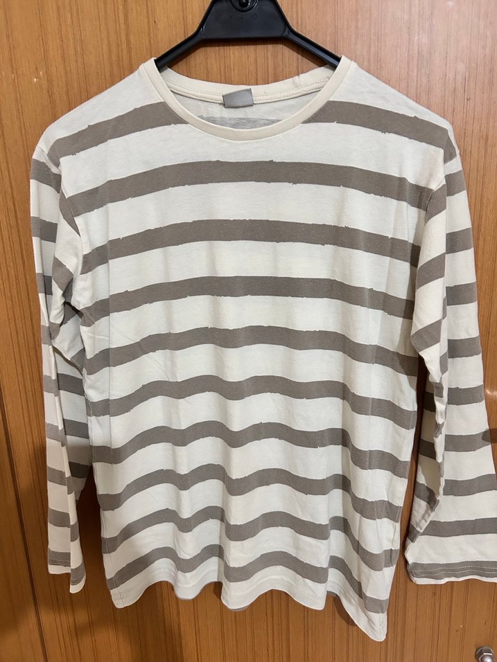 Bu erkek uzun kollu tişört, gri ve bej çizgilerle, yuvarlak yakalı ve bol kesimdir. Yumuşak pamuktan üretilmiştir, günlük kullanım için rahat ve şık bir tercihtir.