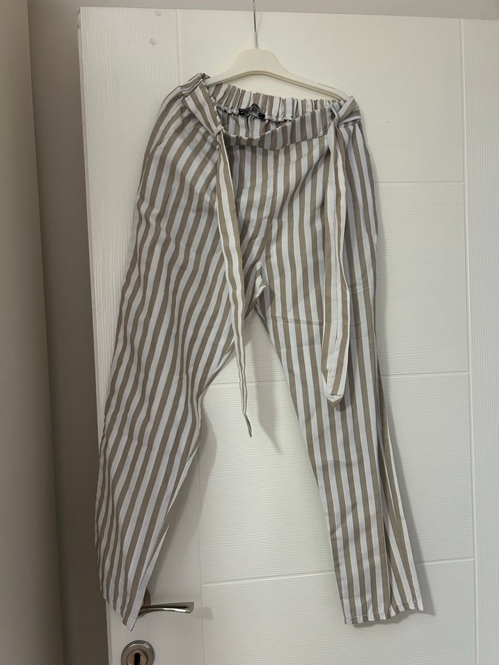 Bej -Gri Çizgili Kemerli Kadın Keten Pantolonlar 2 li fiyatıdır