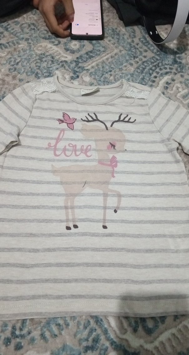 Bej ve gri çizgili, bol kesim kız uzun kollu tişört. Üzerinde geyik ve kuş baskısı, omuzlarda dantel detayları bulunur.