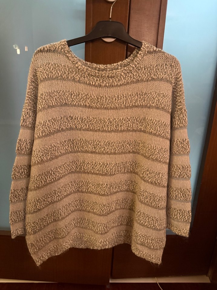Kadınlar için bej ve gri çizgili, yuvarlak yaka, uzun kollu, rahat kesim triko kazak. Günlük kullanıma uygun, konforlu ve sade tasarım.