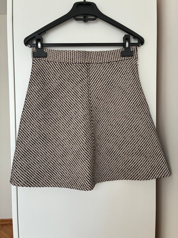 Bu dar kesim mini etek, pilili ve bej-gri çizgili desene sahiptir. Sentetik kumaştan yapılmış, günlük kullanım için çağdaş ve trend bir görünüme sahiptir.