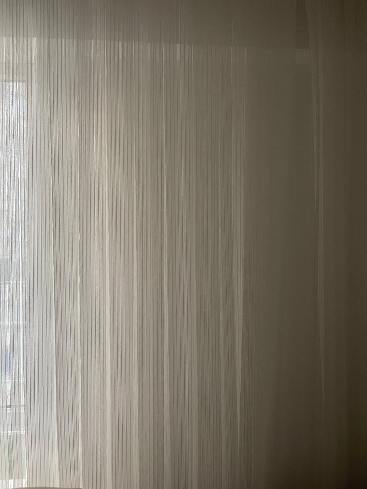 Bej renginde, gri çizgili desenli, modern tarzda hafif ve şık perde.