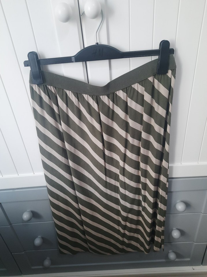 Bej ve gri tonlarda diagonal çizgili, pilili detaylı, bol kesim uzun etek. Yumuşak sentetik kumaştan üretilmiştir, günlük kullanım için uygundur.