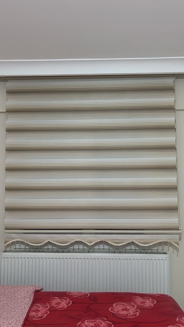 Bej ve gri çizgili klasik stor perde, yumuşak kumaş dokusuna ve alt kısmında hafif dalgalı kenara sahiptir. 170*200
