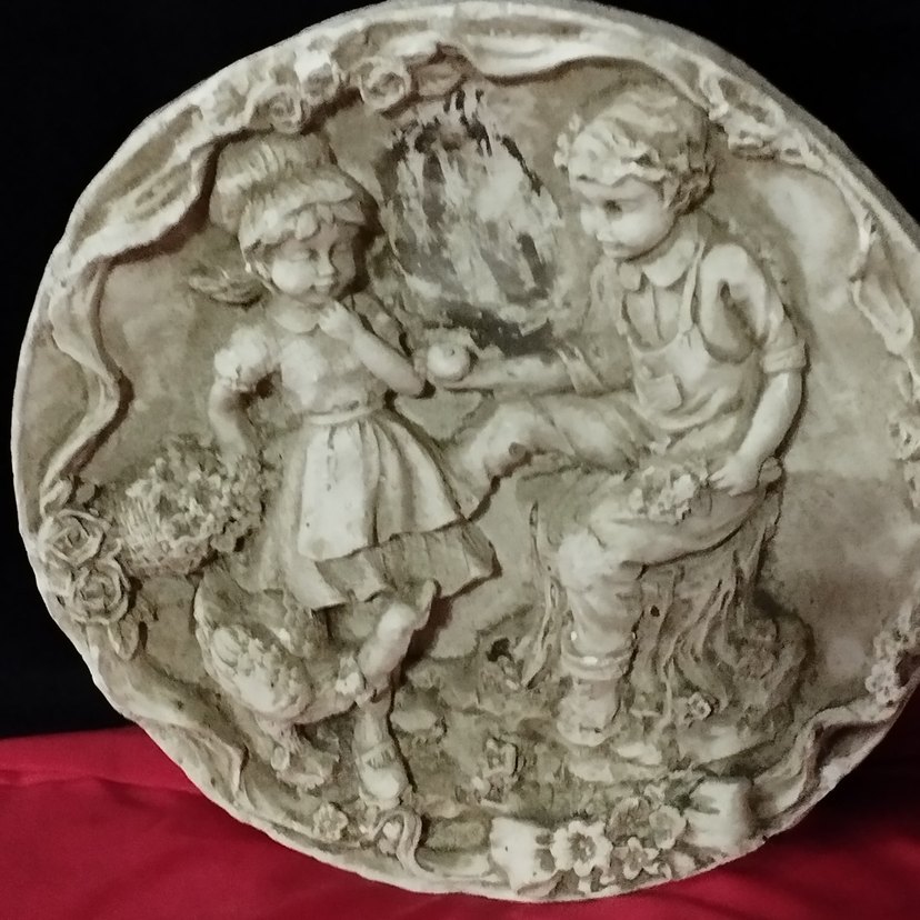 Bej ve gri renklerde, bir çocuğun diğerine elma verdiği, çiçek detaylı dekoratif kabartma tablo.en boy 22cm