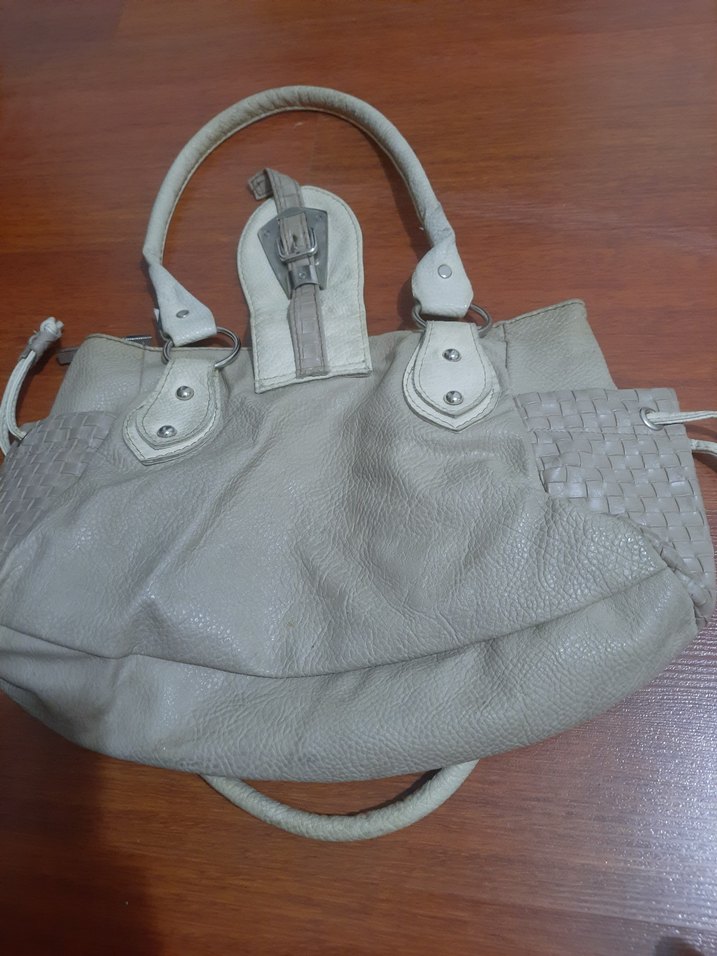 Bej ve gri deri el çantası, tokalı detaylara sahip ve gündelik bohem tarzı için uygundur.