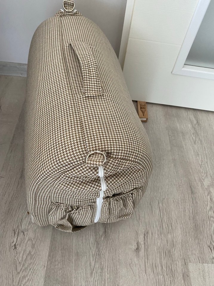 Bej ve gri desenli, taşıma kolaylığı sağlayan kulp ve metal halkalara sahip yumuşak bebek reflü yatağıdır.