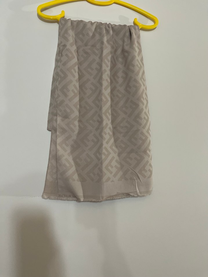 Kadın şalı, bej ve gri desenli sentetik kumaş ile drapeli tasarıma sahiptir, minimalist ve çağdaş bir görünüme sahiptir. ️