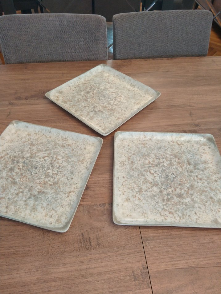 Bej ve gri tonlarında, üç adet kare tabak seti, yemek servisi için uygundur. ️