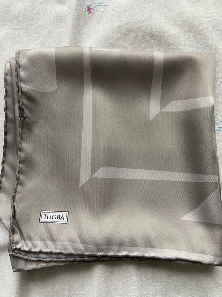Bej ve gri tonlarda, TUGBA markalı,Desenli 2 adet kadın twill kumaş eşarp, Az kullanılmış hasarsız lekesiz düzgün