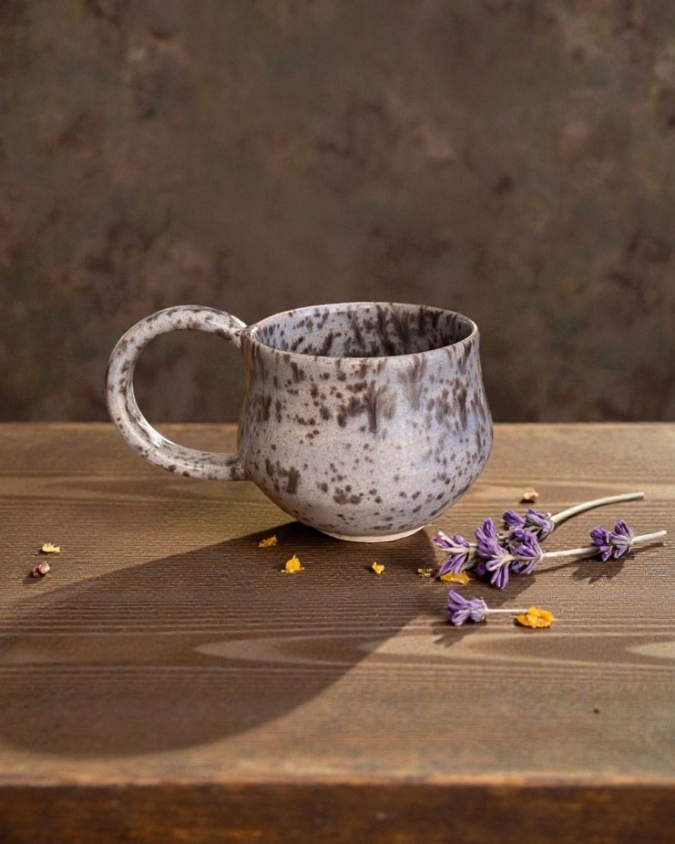 Yuvarlak formda, gri benekli desene sahip bej seramik kupa, benzersiz ve sanatsal bir görünüme sahiptir. ☕ çömlekçi tornasında elle şekillendirilmiştir 200 ml