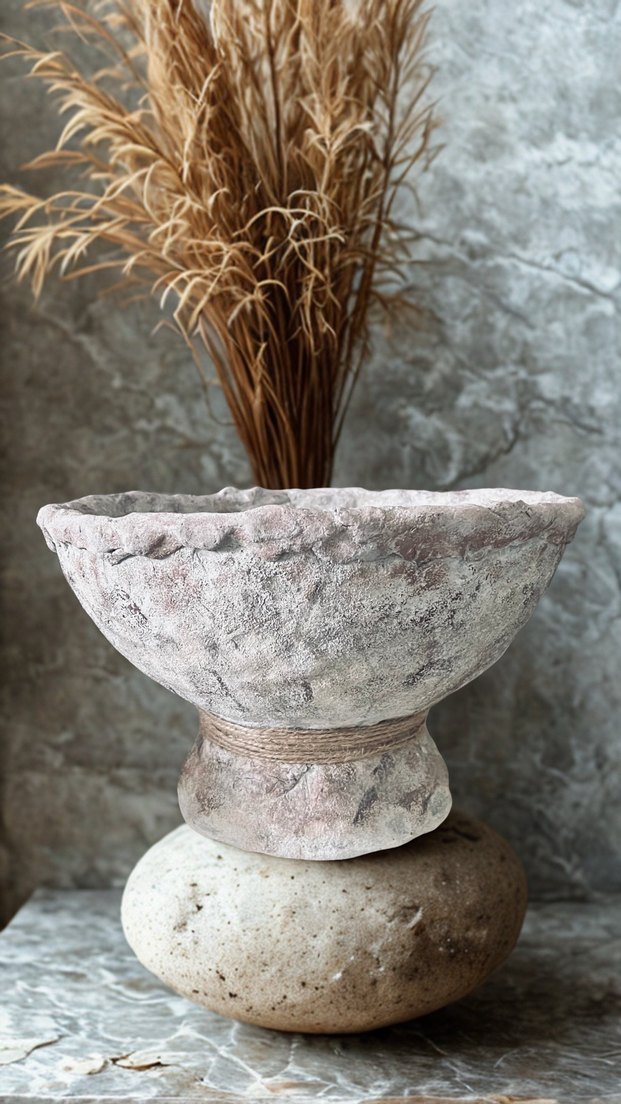 Bej ve gri tonlarda dokulu yüzeye sahip, geniş ağızlı ve sağlam tabanlı dekoratif vazo. Kuru çiçekler için veya tek başına kullanılabilir.