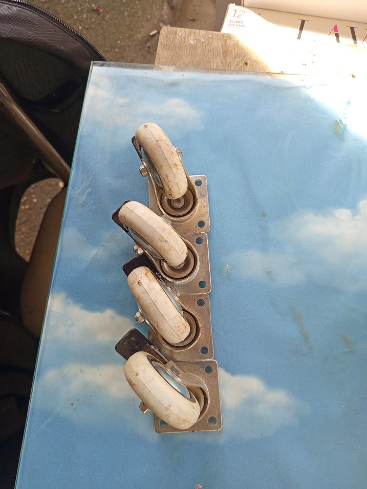 Metal montaj plakalarına sahip bej ve gri döner tekerlek seti, mobilya veya ekipman hareketliliği için uygundur. ️