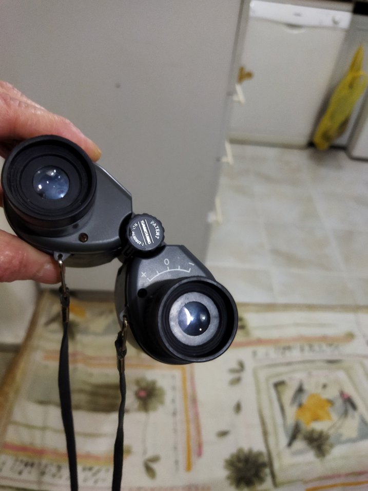 Ayarlanabilir odak ve taşıma kayışı bulunan kompakt bej-gri dürbün. Açık hava etkinlikleri için uygun.