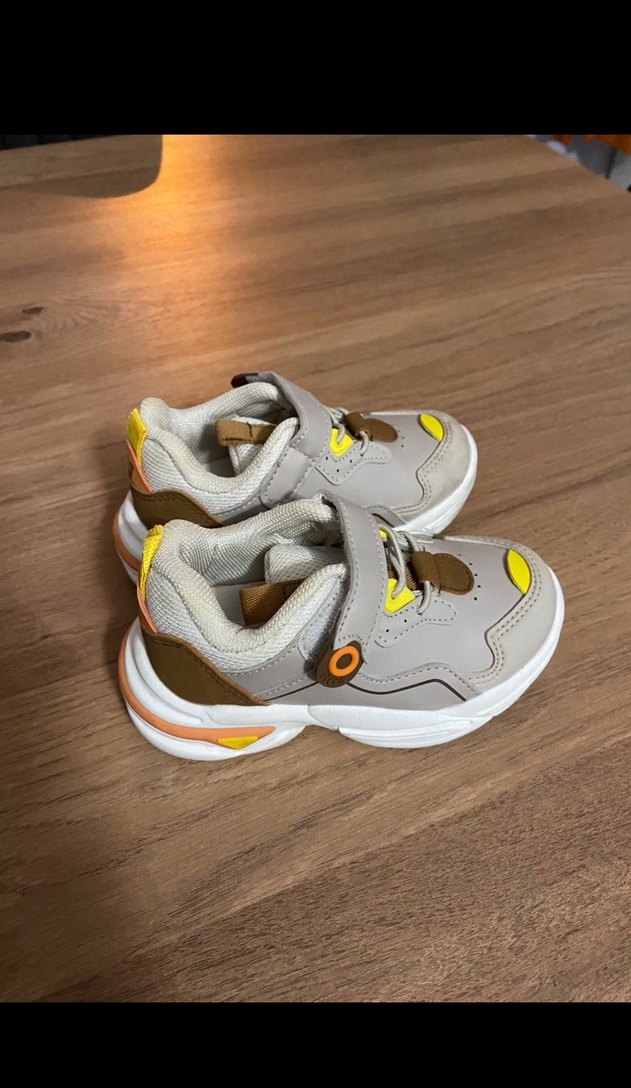 Bej ve gri renklerde, baskılı detaylı, velcro kapanışlı ve kauçuk tabanlı erkek çocuk spor ayakkabısı. Rahat ve trend sokak stili için uygun.