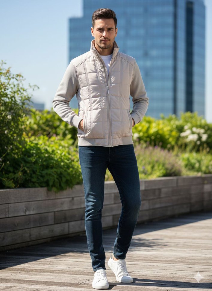 Bej ve gri tonlarında, yumuşak fleece kumaştan üretilmiş, fermuarlı ve bisiklet yaka uzun kollu erkek mont.s bedini de mevcuttur