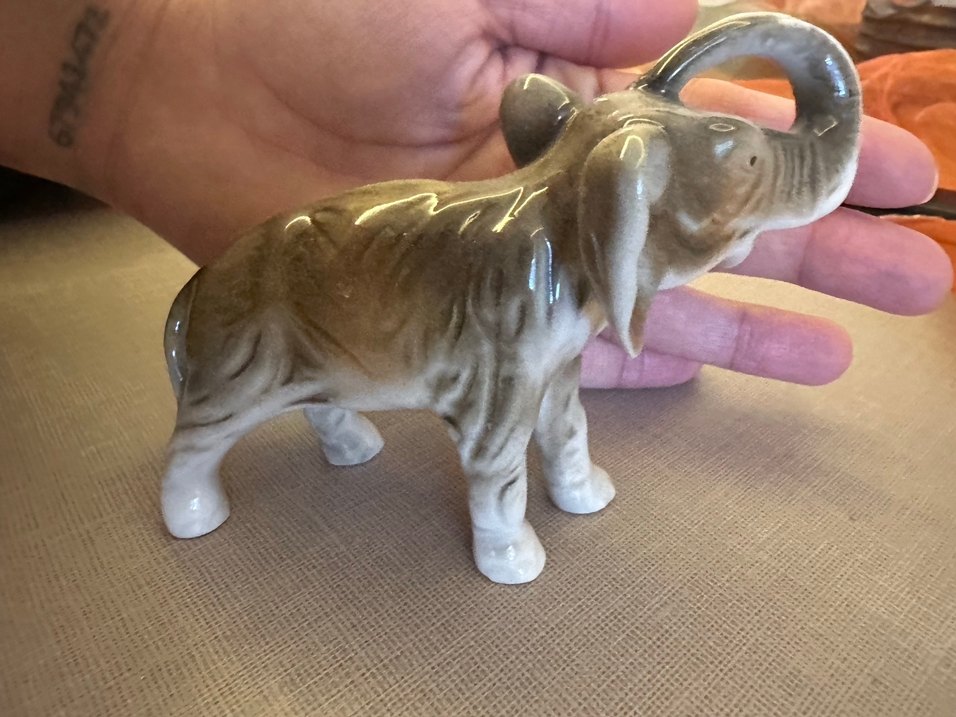 Parlak yüzeye sahip bej ve gri seramik fil figürin, detaylı özellikleri ve kalkık hortumuyla dikkat çekiyor.