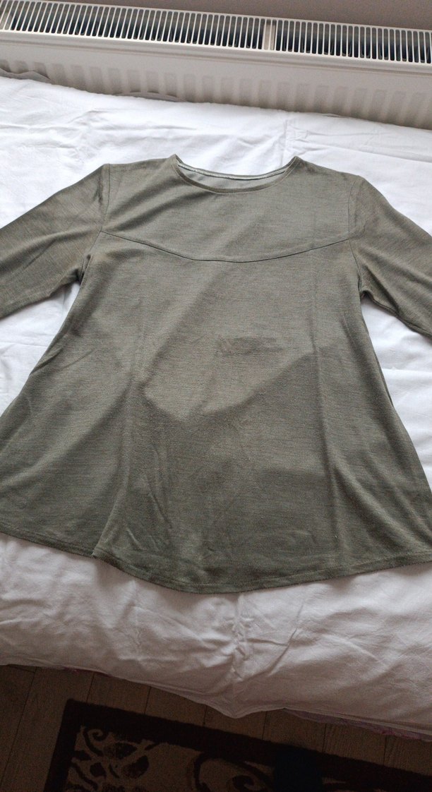 Bej gri tonlarında, keten kumaştan, yuvarlak yakalı ve uzun kollu hamile tişörtü. Salaş kesimi ve normal boyu ile günlük kullanıma uygun, sade ve rahat bir modeldir.