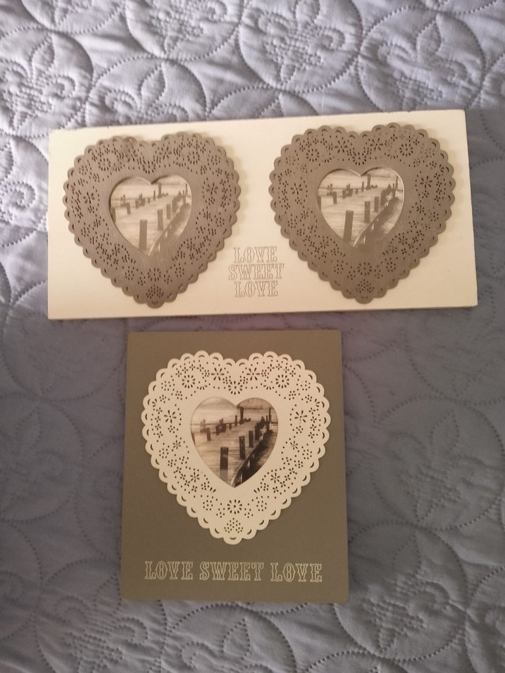 Bej ve gri kalp şeklinde, dantel görünümlü kenarlara sahip fotoğraf çerçeveleri. Her çerçevede 'LOVE SWEET LOVE' yazısı ve küçük fotoğraf bulunur. ❤️