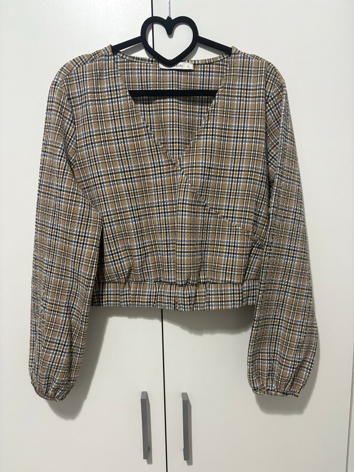 Bej Gri Kareli Düğmeli Kadın Bluz