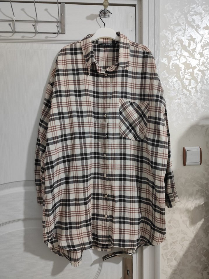 Bej ve gri kareli, pamuklu, salaş kesim uzun kollu gömlek. Düğmeli ve yakalı, göğüs cebine sahip rahat ve konforlu stil.